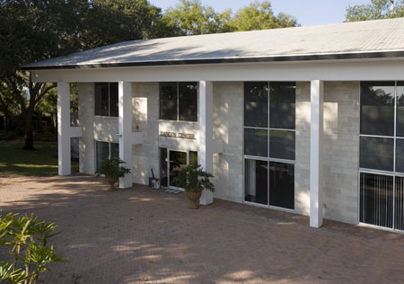 The site's surrounding walls are now packed with mature creeping fig, offering natural beauty and color to the expansive courtyards within. You will see it often on this tour in many stages of growth. Leedy chooses it because it is hardy in the Florida climate, while gentle to the surface yo which it clings, an example of the honesty of materials and complimentary natural elements in Leedy's designs.