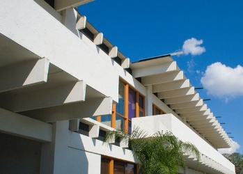 The Taxdals told Leedy what they needed and he complied with their wishes while still retaining all the hallmarks of his work. On the exterior, balconies resting on double T beams are of note. Many of the doctor's offices have them.